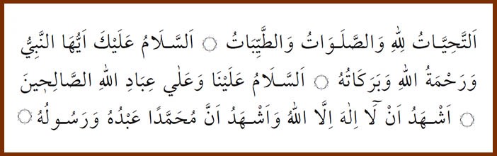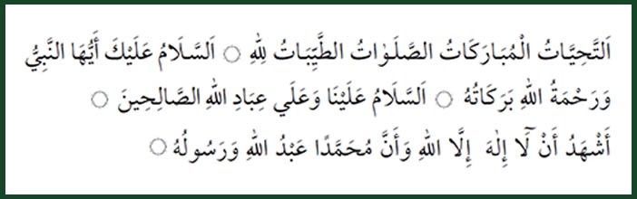 اَلتَّحِيَّاتُ اَلْمُبارَكاتُ اَلصَّلَوَاتُ اَلطَّيِّباَتُ لِلَّهِ، اَلسَّلامُ عَلَيْكَ أيُّهَاالنَّبِيُّ وَرَحْمَةُ اللَّهِ وَبَرَكَاتُهُ، اَلسَّلامُ عَلَيْنَا وَعَلَى عِباَدِ اللهِ الصَّالِحيِنَ، أَشْهَدُ أَنْ لاَ إلَهَ إِلاَّ اللَّهُ، وَأَشْهَدُ أنَّ مُحَمَّداً رَسُولُ اللَّهِ