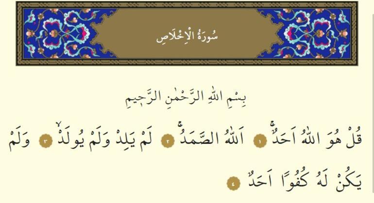 “Kul huvellâhu ehad. Allâhussamed. Lem yelid ve lem yûled. Ve lem yekullehû kufuven ehad”
