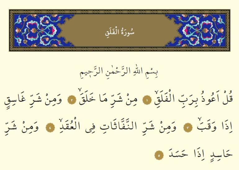 Yarattığı şeylerin kötülüğünden, karanlığı çöktüğü zaman gecenin kötülüğünden, düğümlere üfleyenlerin kötülüğünden, haset ettiği zaman hasetçinin kötülüğünden, sabah aydınlığının Rabbine sığınırım.