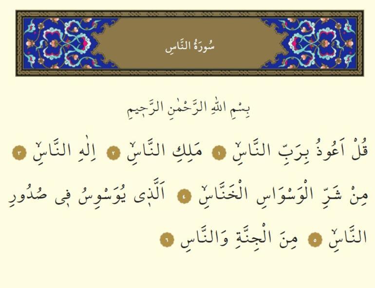 De ki: “Cinlerden ve insanlardan; insanların kalplerine vesvese veren sinsi vesvesecinin kötülüğünden, insanların Rabbine, insanların Melik’ine, insanların İlah’ına sığınırım.”