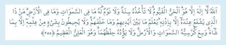 “Allâhü lâ ilâhe illâ hüvel hayyül kayyûm, lâ te’huzühu sinetün velâ nevm, lehu mâ fissemâvâti ve ma fil’ard, men zellezi yeşfeu indehu illâ bi’iznih, ya’lemü mâ beyne eydiyhim vemâ halfehüm, velâ yü-hîtûne bi’şey’in min ilmihî illâ bima şâe vesia kürsiyyühüssemâvâti vel’ard, velâ yeûdühû hıfzuhümâ ve hüvel aliyyül azim.”