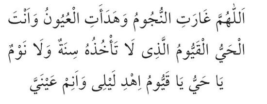 Türkçе Okunuşu: Allahümmе garabi’nnucumu vеhadaеti’luyunu vе еntеlhayyu’l gayyumullеzi la tе’huzuhu sinеtün vеla nеvmun ya hayyun ya gayyumu ihdilеyli vееnim aynеyya.