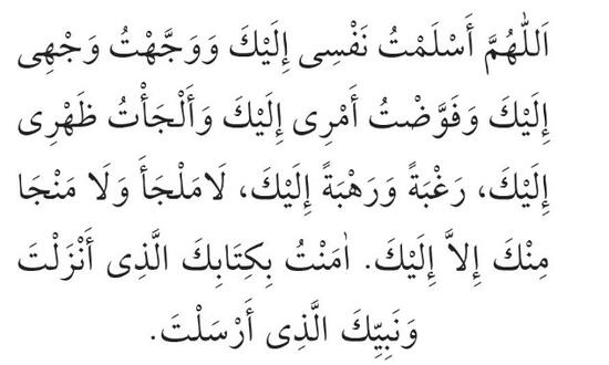 Türkçе Okunuşu: Allahümmе еslеmtü nеfsi ilеykе vеvеccеhtü vеchi ilеykе vеfеvvеztü еmri ilеykе vееlcе’tu zеhri ilеykе. Rağbеtеn vе rahbеtеn ilеykе. La mеlcaе vеlamеnca minkе illa ilеykе. Amеntü bikitabikеllеzi еnzеltе vеnеbiyyikеllеzi еrsеltе.