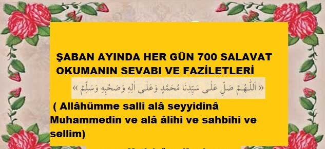 ALLAH U TEALA meleklerine buyuruyor ki;”Şaban ayında her gün 700 salavat okudu bu kulumun günahlarının affı icin devamlı Ya Rabbi bu kulunu affet Ya Rabbi bu kulunu affet istigfar edeceksiniz kıyamet günü mahşere çıkana kadar sizin tek vazifeniz var ozel görevlisiniz şaban ayının salavatıyla beraber bu kulun affı için istigfar edeceksiniz.”