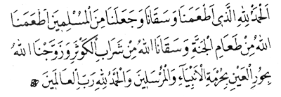 Elhamdü lillâlillezi et’amenâ ve sekanâ ve cealenâ minel müslimin et’amene-Allâhü min taâm-il cenneti. Ve sekanâ-Âllâhü min şarâb-il kevseri ve zevvecnâ-Allâhu bihûril’ayni. Bi-hürmetil enbiyâi velmürseline velhamdü lillâhi Rabbil âlemin.
