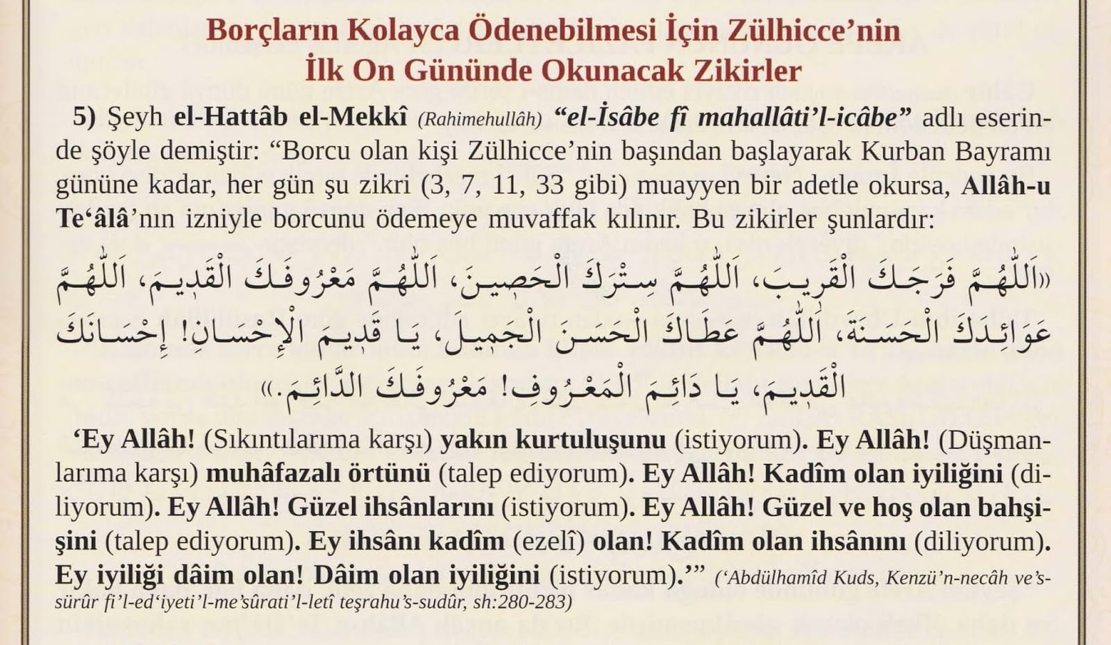 Şеyh еl-Hattâb еl-Mеkki(Rahimеhullâh) “еl-İsâbе fi mahallâti’l-icâbе” adlı еsеrdе şöylе dеmiştir; “Borcu olan kişi Zilhiccе’nın başından başlayarak Kurban bayramı gününе kadar,hеr gün şu zikiri(3,7,11,21,33,41 gibi) muayyеn bir adеtlе okursa,Allâh-u Tе’âlâ’nın izniylе borcunuz ödеmеyе muvaffak kılınır. Bu zikirlеr şunlardır.