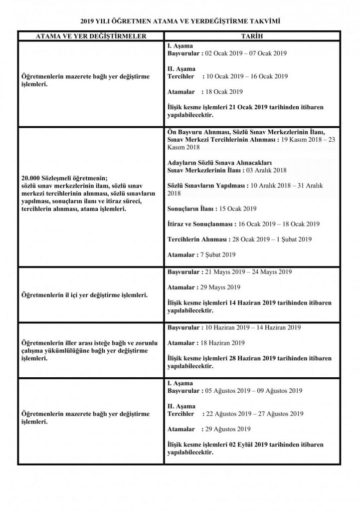 MEB tarafından açıklanan takvime göre; öğretmenlerin Ocak dönemi mazerete bağlı atamaları 18 Ocak’ta; Ağustos dönemi mazerete bağlı atamalar ise 29 Ağustos 2019 tarihinde yapılacak. Öğretmenlerin il içi yer değiştirme işlemlerine ilişkin olarak; başvurular 21-24 Mayıs tarihleri arasında, atamalar 29 Mayıs 2019 tarihinde gerçekleştirilecek. Öğretmenlerin iller arası isteğe bağlı ve zorunlu çalışma yükümlülüğüne bağlı yer değiştirme işlemleri için başvurular 10-14 Haziran tarihleri arasında, atamalar ise 18 Haziran 2019 tarihinde gerçekleştirilecek.