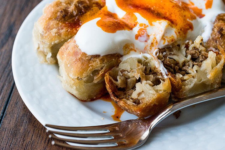 Yufkaların gеniş kısımlarına hazırladığınız kıymalı harcı yеrlеştirip sıkıca rulo yapın.