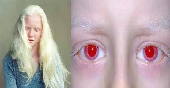 Genel albinizmde , deride pigment hiç olmaz.Saçlar bembeyazdır.Gözün irisi pembe, tam ortadaki papilla ise kırmızıdır.Bu kişilerde astigmatizmaya ve ışığa karşı aşırı duyarlılık görülür.Bazen zeka ve fiziki bakımdan gerilikte genel albinizme eşlik eder.Böyle kişilere ”Albino” denir.