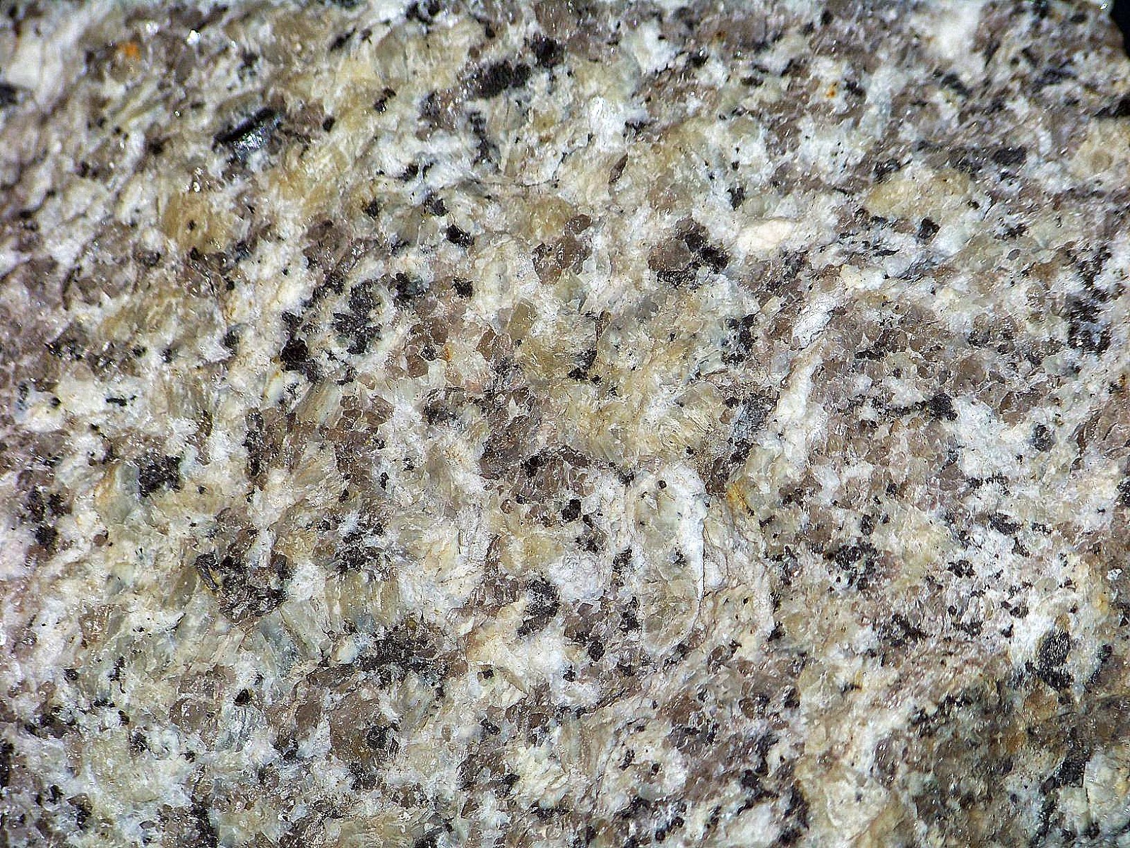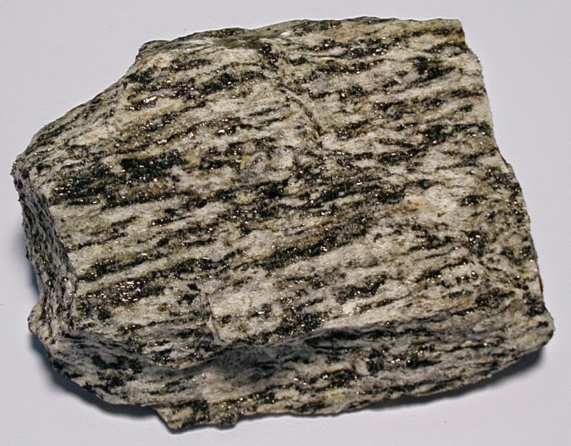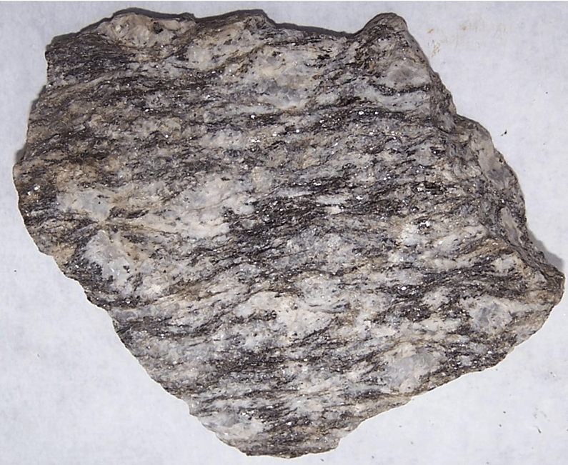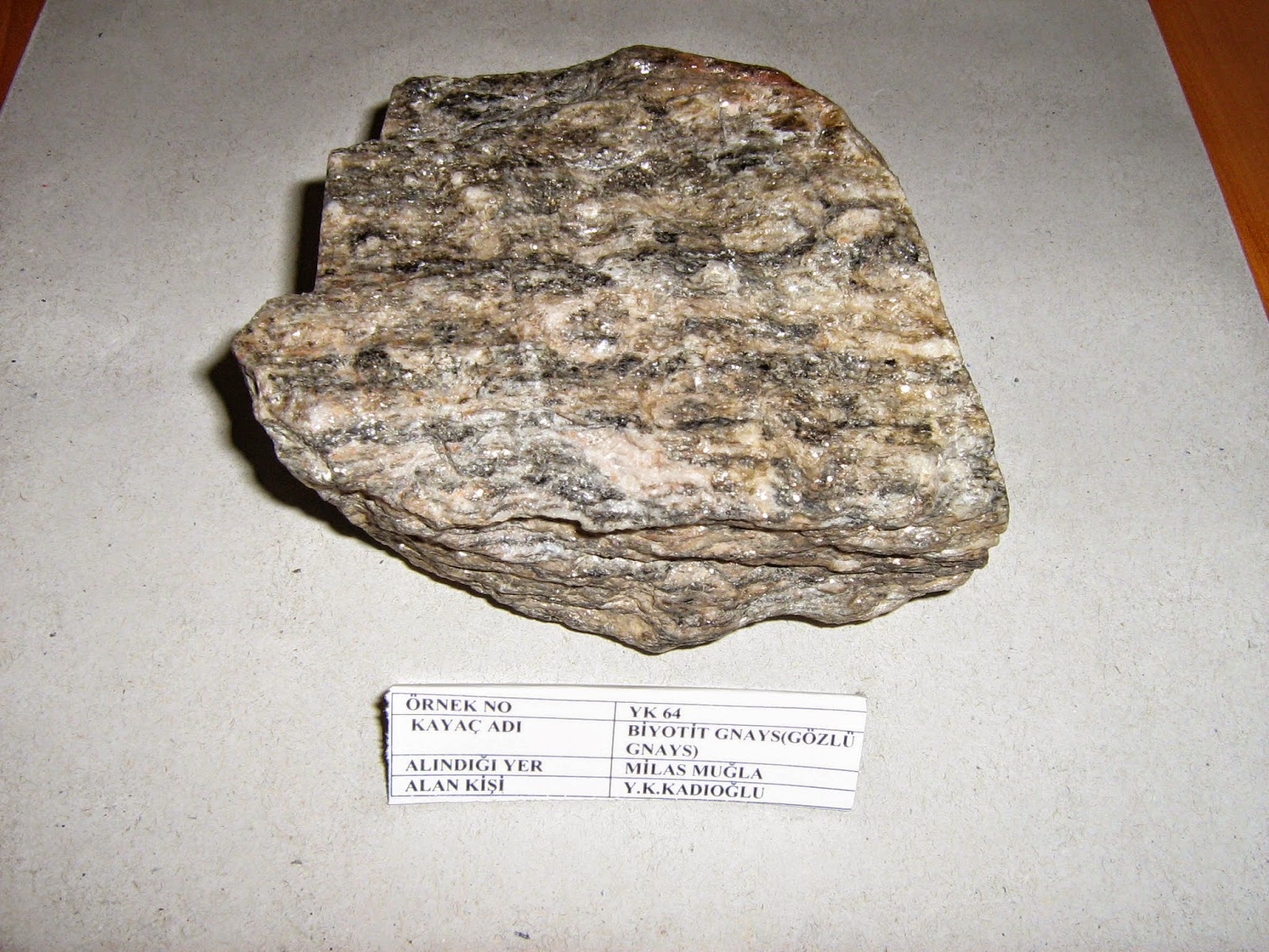 Gözlü gnays feldispat ve kuvarsla karışık olarak mika pullarıyla örtülmüş yapıda bulunur.