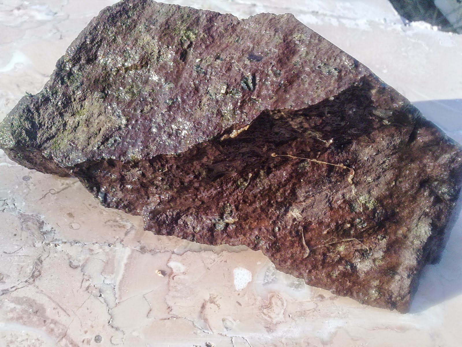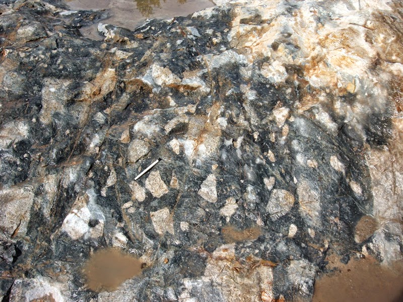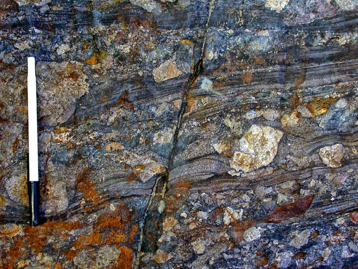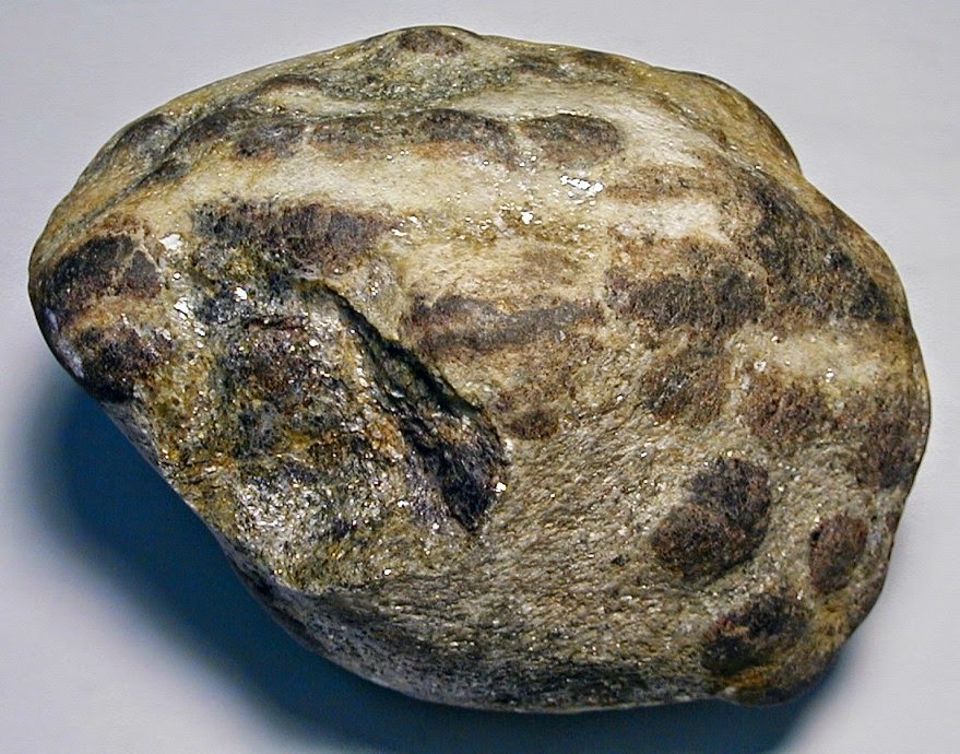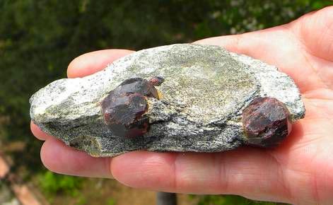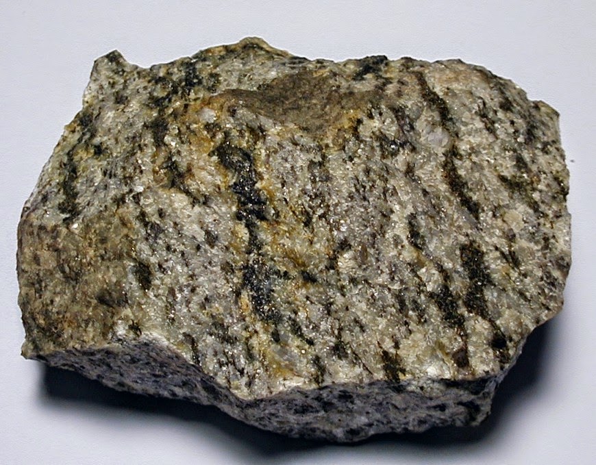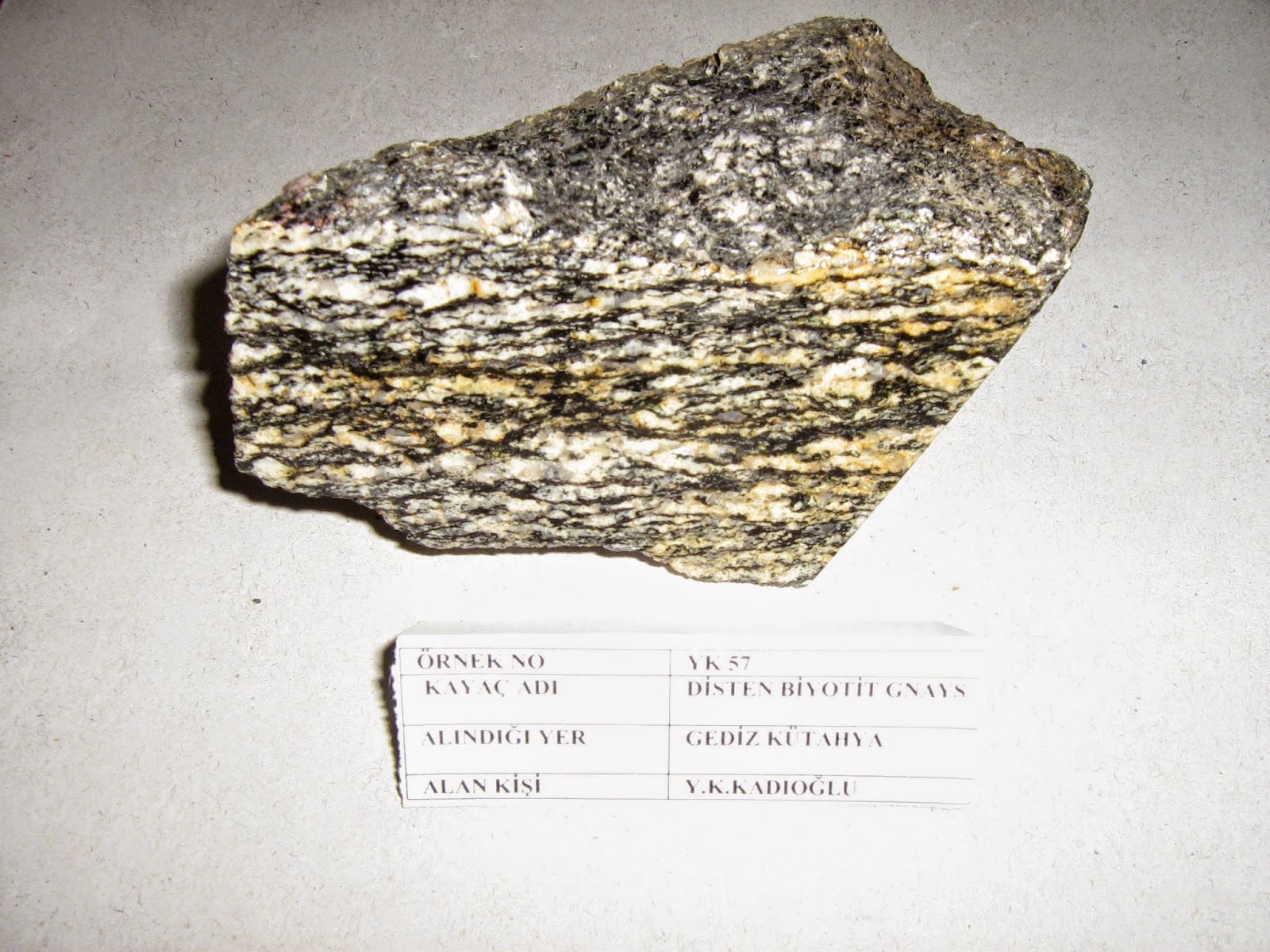 Gözlü gnays feldispat ve kuvarsla karışık olarak mika pullarıyla örtülmüş yapıda bulunur.