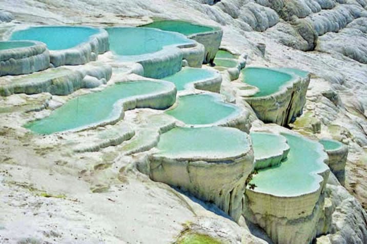 Bbasınç altında, bünyesinde erimiş karbon dioksit bulunan yeraltı suları, geçtikleri bölgelerdeki kalsiyum karbonatı (CaCO3) eriterek taşır. Suyun aniden açığa, basınçsız ortama çıkması ve karbondioksitin uçması ile, suda erimiş bulunan kalsiyum karbonat çok ince katmanlar halinde kayaların üzerine çöker. Bu birikim zamanla yastık gibi yumuşak hatları olan travertenleri oluşturur.