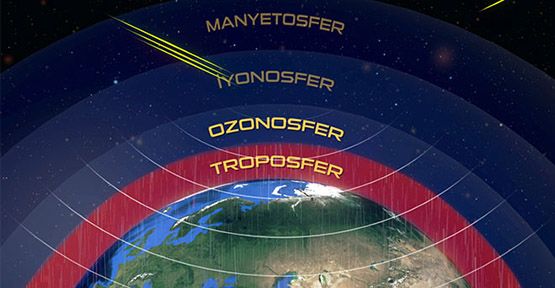 Dünyanın etrafını saran çoğunlukla gaz ve buharlardan oluşan saydam ve renksiz katmandır. Ancak atmosferin içerisinde bulunan su buharı güneşten gelen ışınların bir prizma gibi kırarak ışınların mavi görünmesine sebep olur .Atmosferin bu mavi görünümü okyanus ve denizlerin üzerine yansıyarak aslında renksiz olan su kütlelerinin mavi görünmesini sağlar. Atmosferin ortalama kalınlığı 10 bin kilometredir. Ekvatorda kalınlık fazla ,kutuplarda ise azdır .Atmosferin alt katları diğer katlarına oranla daha sıcaktır. Çünkü atmosfer yerden yansıyan ışınlarla ısınır atmosferin yoğunluğu yerden yükseldikçe azalır. Ağır gazlar ,alt tabakalarda hafif gazlar üst tabakalarda toplanmıştır. Her zaman bulunan ve miktarı değişmeyen gazlar y,üzde 78 azot, yüzde bir oksijen, yüzde bir asal gaz vardır. Her zaman bulunan ve miktarı zaman zaman değişen gazlar su buharı ve karbondioksittir. Atmosferin yüzde 3 ünü oluşturan CO2 iki katına çıkması halinde yeryüzünde sıcaklık artar. CO2 yarıya düşmesi halinde yeryüzünde sıcaklık azalır. Dünyayı çepeçevre kuşatan atmosfer, canlılığın devamı için son derece hayati işlevleri yerine getirir. Dünyaya doğru yaklaşan irili ufaklı pek çok göktaşını eriterek yok eder ve bunların yeryüzüne düşerek canlılara büyük zarar vermesini engeller. Bunun yanı sıra uzaydan gelen ve canlılar için zararlı olan ışınları da filtre eder. Atmosferin bu özelliğinin en çarpıcı yönü atmosferin sadece zararsız orandaki ışınları yani görünür ışık kızılötesi ışınlar ve radyo dalgalarını geçirmesidir. Bunların tümü yaşam için gerekli ışınlardır. Örneği atmosfer tarafından belirli oranlarda geçmesine izin verilen ultraviyole ışınları bitkilerin fotosentez yapmalarını ve dolayısıyla tüm canlıların hayatta kalmaları açısından büyük önem taşır .Atmosferin koruyucu özelliği bunlarla da kalmaz. Dünya, uzayın ortalama -270 derecelik dondurucu soğuğunda yine atmosfer sayesinde korunur. Atmosfer, güneş ışınlarının kalmasını sağlayarak gölgede kalan kısımlarında aydınlanmasını sağlar.