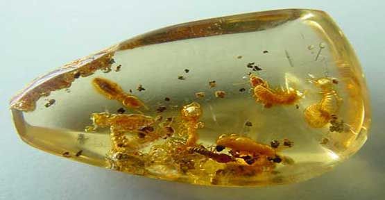 Ağaçlardan salgılanan reçinenin canlının üzerinde donması ve canlının o anki haliyle muhafaza edilmesiyle fosiller oluşur.İçinde fosil bulunduran bazı kehribarlarda canlıların yaşamlarının o anki durumları görülebilir.Avcı böcek ile avı, parazit veya kene ile beslenen canlı, kavga eden karıncalar bu hapsolmuş görüntülere örnektir. Kehribarlar içinde sadece böcek örneklerine değil bitki türlerine,memeli türlerine hatta kurbağa ve semenderlere de rastlanır.