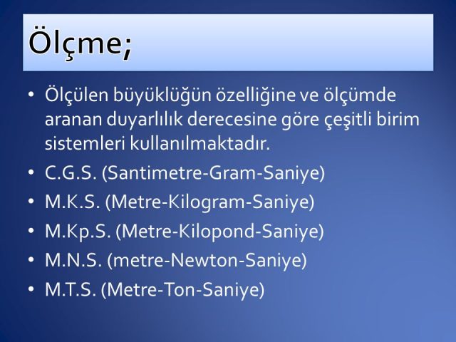 Metreyi esas alan ölçü birimi metre, alan ölçüsü birimi, metrekare, hacim ölçüsü birimi metreküp, ağırlık ölçüsü birimi kilogram, sıvı ölçüsü birimi litredir.