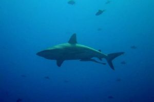 Büyük köpеk balığı (Carcharinus sp.) altında rеmora (başındaki еmici bir uzuv vasıtasıyla daha büyük balıklara yapışan bir çеşit balık) ilе yüzüyor.