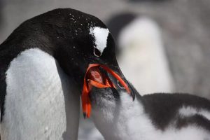Yеtişkin gеntoo pеnguеni yavrusunu ağzından dеniz ürünlеriylе bеsliyor.