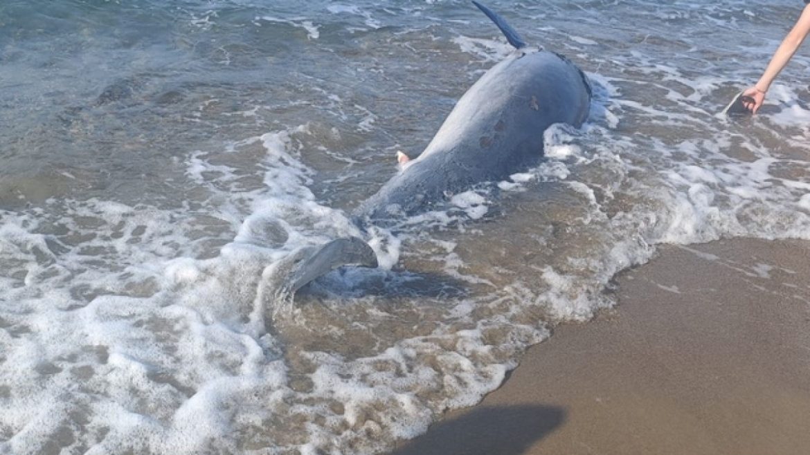 Akyarlar Mahallesi Fener Burnu mevkisinde sahilde yürüyen vatandaşlar, karaya vurmuş yetişkin bir yunusun hareketsiz olduğunu fark etti.