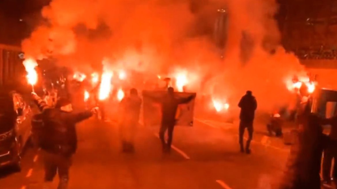 GALATASARAY TARAFTARI TAKIM OTOBÜSÜNÜ MEŞALELERLE KARŞILADI