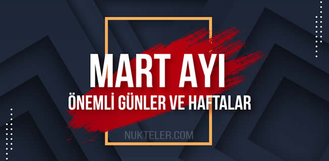 Mart, bahar mevsiminin başlangıcı ve yılın 3. ayıdır. Her ay olduğu gibi Mart ayında da kutlanan birkaç önemli gün ve belirli özel hafta daha var.